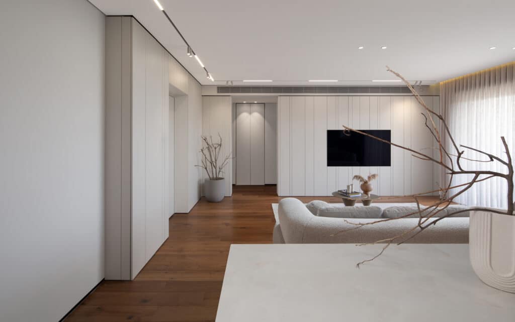 פרויקט נגרות מינימליסט שבו קיר האחסון המרכזי תוכנן כחלק אינטגרלי מקיר הטלוויזיה, וממשיך בקו אחיד אל מסדרון החדרים. החיפוי הנקי מסתיר מערכות אחסון ועבודה בתוך מעטפת אחידה ומדויקת, היוצרת תחושת חלל פתוח, שקט ומאוזן.