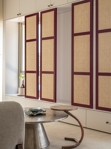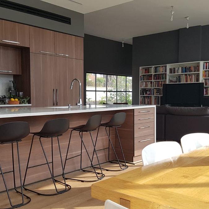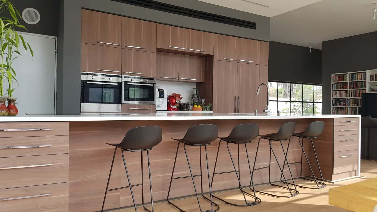 פרויקט נגרות לכל הבית עבור זוג צעיר בקיבוץ חורשים, בעיצוב מודרני-חמים בשילוב אגוז אמריקאי. קיר הטלוויזיה מוסתר מאחורי דלתות הזזה מקליעת ראטן, ומשתלב ברצף אחד עם ארונות האחסון והמטבח.