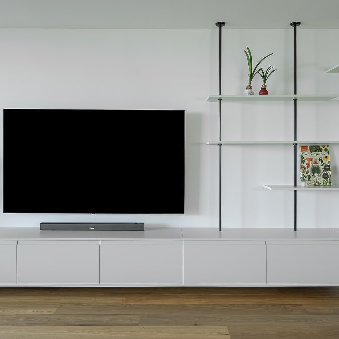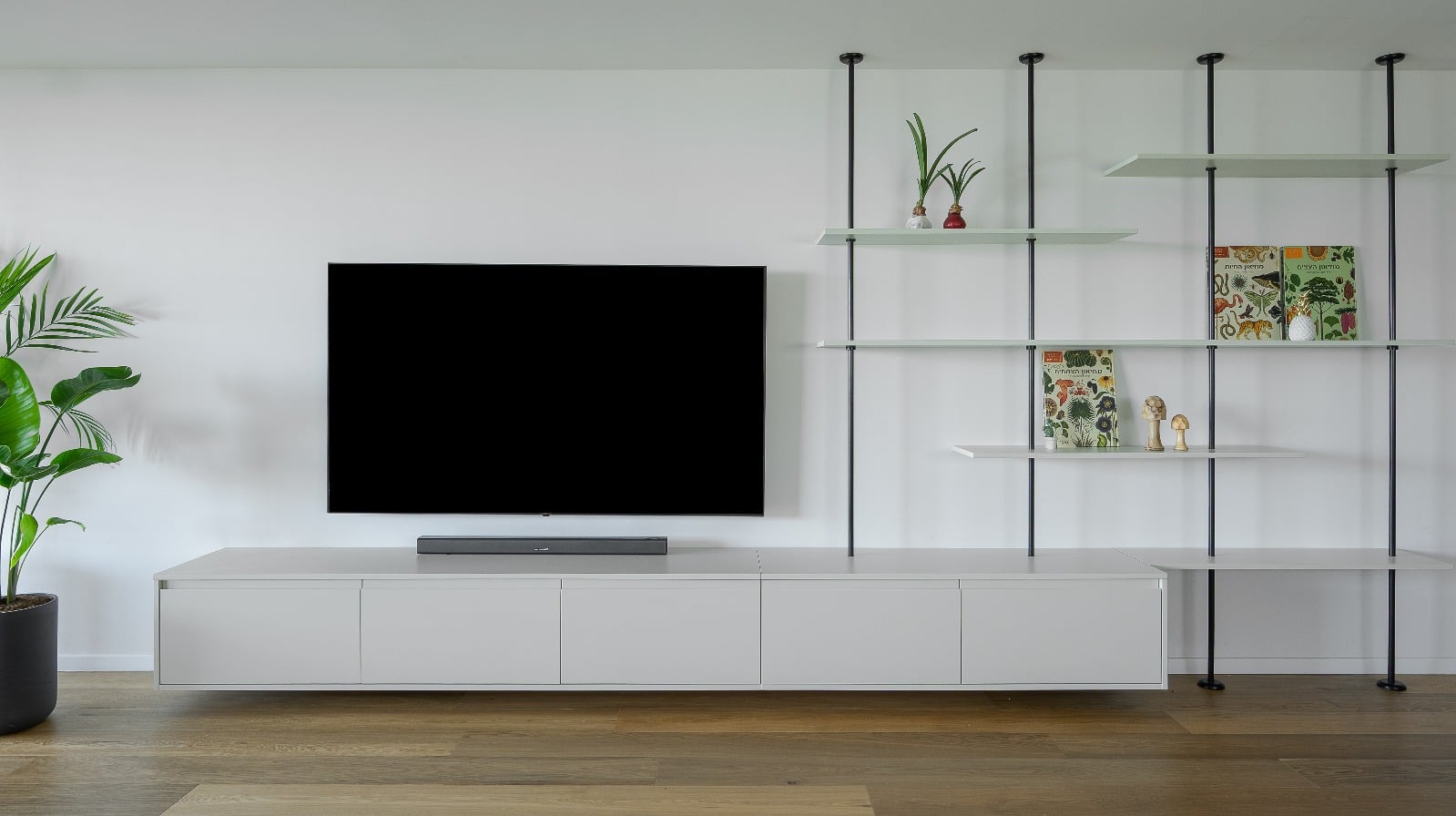 קיר טלוויזיה מינימליסטי הכולל מזנון נמוך ורחף בשפה נקייה, לצד מערכת מדפים תלויים על עמודי ברזל דקים. ההרכבה האנכית יוצרת תחושת קלילות וגובה, ומשלבת פונקציונליות עם נגיעה אלגנטית ומודרנית